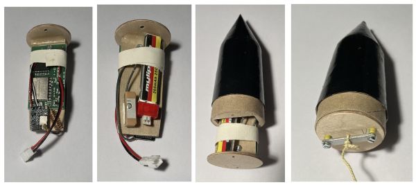 Hier ist eine Variante des Tracking-Senders eingebaut, die etwas kürzer, dafür aber breiter ist und statt einer einfachen Drahtantenne eine Wendelantenne hat. Der GPS Empfänger Beitian BN220 wäre zu groß. Es kommt daher ein kleinerer zum Einsatz. Mit zwei Schrauben wird der Einschub in der Spitze befestigt, womit auch gleich ein Ankerpunkt zur Befestigung des Schockbands zur Verfügung steht.