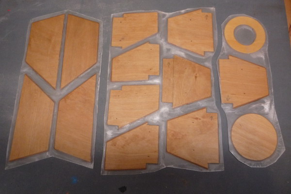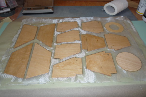 Die ausgesägten und egalisierten Fins machten durch das Buchensperrholz schon einen recht anständigen Eindruck, während sie quasi "auf Abruf bereit lagen". Als es dann losging habe ich sie aber beidseitig mit drei Lagen Glasgewebe belegt (2x80g/m² + 49g/m²).