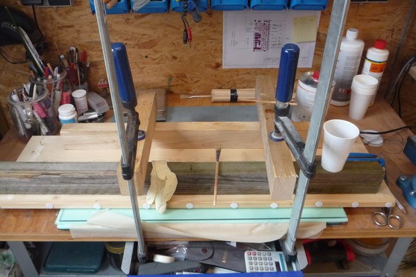 Das Laminat liegt in der Presse zwischen zwei Glasscheiben. Habs bei früheren Projekten direkt aufs Glas gelegt, das ich vorher mit Formtrennmittel behandelt habe.