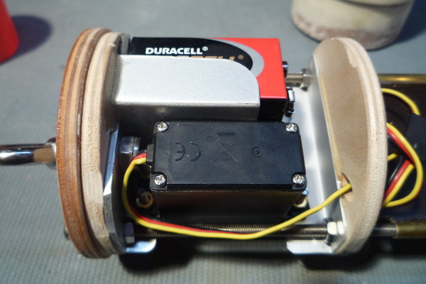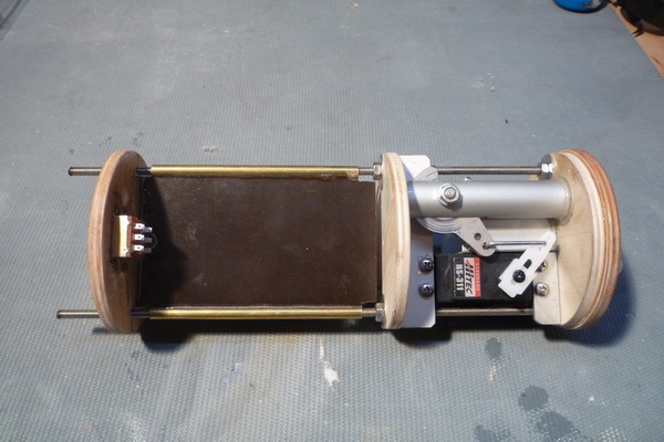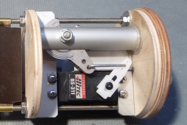 Hier die Anlenkung in meiner Konstruktion durch ein Standartservo mit 35N/cm. (Rechts ist Fallschirmseite)
