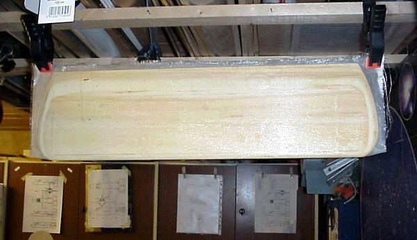 Wie du vielleich auf dem Bild erkennst, hängt der laminierte Flügel mit der Vorderkante nach unten im Gewebe wie in einer Schlaufe... es erübrigt sich eigentlich noch was dazu zu sagen... an der Vorderkante liegt in jedem Fall allein durch das Gewicht des Flügels das Gewebe am Holz an. Uff, du schaffst mich. Ich kann es nicht besser erklären. Ciao, Rolli