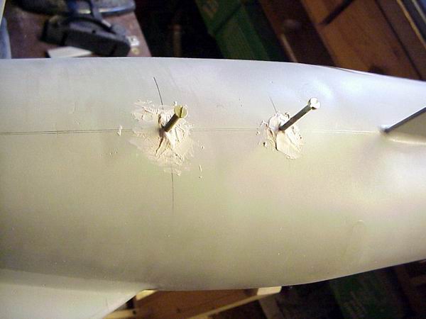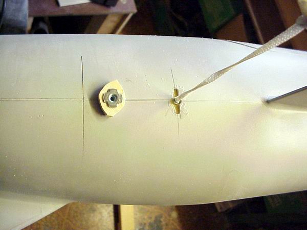 Weiter gehts mit der Bachem Natter. Wenn ihr wissen wollt, wie ich eine Einschlagmutter in ein Rohr einbaue, wo man von innen nicht mehr heran kommt? Hier der Trick mit einem Bindfaden. Es wird ein Spalt gefräst, wo man die in einem kleinen Stück Sperholz gefasste Einschlagmutter quer durchschieben kann. Zuvor wird durch die Mutter ein Bindfaden gesteckt, am anderen Ende ein dicker Knoten, mit dem die Mutter an die Innenwandung gezogen wird. Epoxy drauf, warten bis der Kleber angezogen hat, dann den Bindfaden abschneiden. Der durchgestoßene Knoten verbleibt im Rohr. Folgende Datei wurde angehängt: |