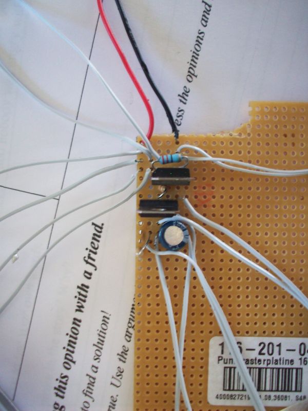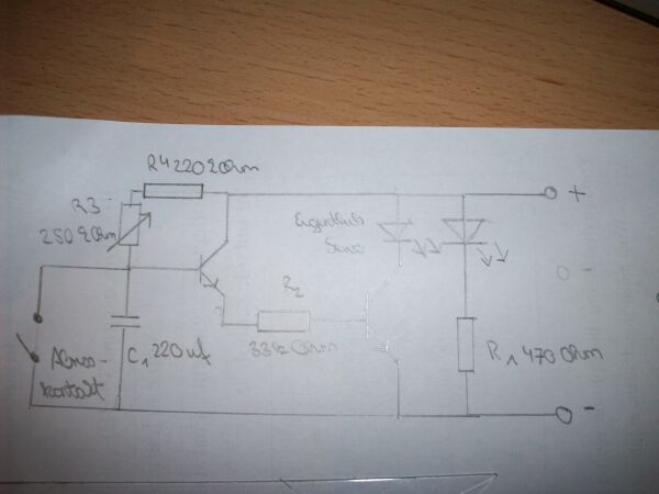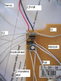 Habe die Schaltung jetzt noch mit einem parallel geschalteten Kondensator mit 100uf erweitert und siehe da sie funktionierte einwandfrei. Danach habe ich das ganze mit dem Servo ausprobiert aber die Spannung von von ca. 2,5 Volt reichte überhaupt nicht aus. Des Weiteren hab ich bei geschlossenen Abrisskontakt immer noch 1,9 Volt am Anschluss zum Servo. Jetzt hab ich noch den Servo direkt an einen regelbaren Trafo mit 2,5 Volt angeschlossen und dort läuft er einwandfrei. Dann müsste es an der Stromstärke liegen oder ? P.S. Die Schaltung wurde nicht mit Batterien sondern mit dem vorher genannten Trafo betrieben. Mfg David Wagner |