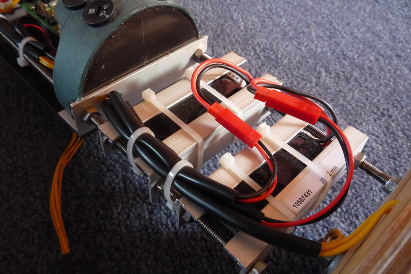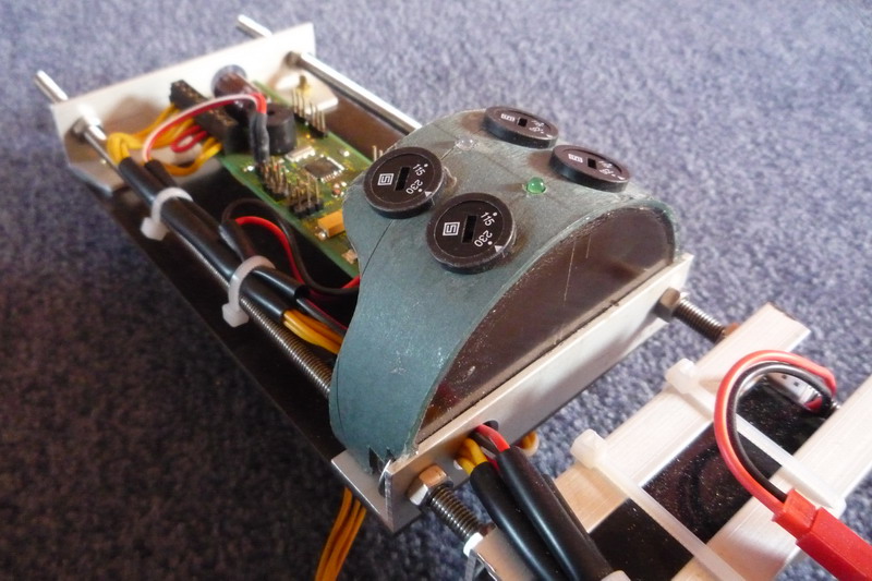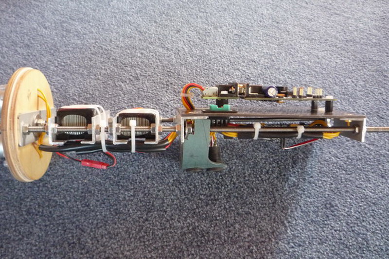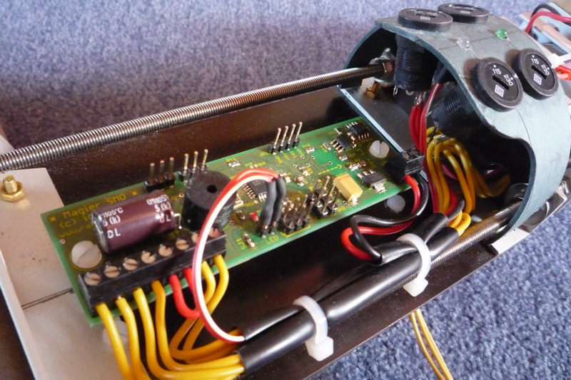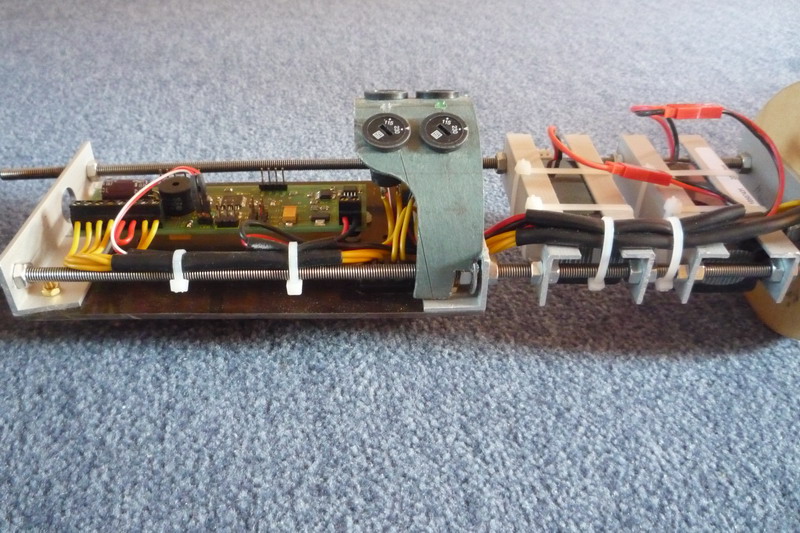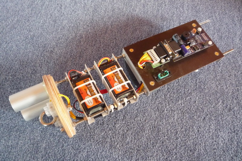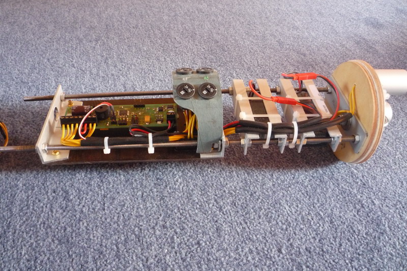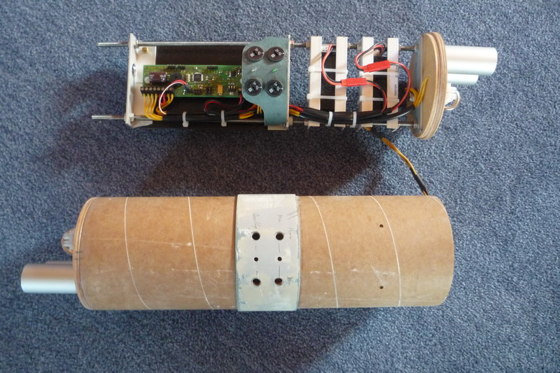So, weiter gehts, ein paar Fotos hab ich noch. Zweistufige Bergung, redundante Bauweise. Schon bewährt in meiner Level 1 und T2-Prüfungsrakete PML Quasar. Hier als Main-System ein Altimax von Louis und als Parallel-System ein Magier von Uli. Jeweils mit eigener Stromversorgung, eigenem Power-Schalter, eigenem S/US-Schalter, eigenem Drogue- und Main-Zünder mit jeweils eigener Ausstoßladung. Auf der Drogue-Seite wäre da auch noch ein eventuelles Motordelay als Backup vom Backup..... Safety first. Untergebracht in einer 4" mal 30cm Ebay, endlich mal reichlich Platz.... Montage auf einem Gestell aus zwei M5 Gewindestangen und reichlich Aluwinkelprofilen. Beide Elektroniken sind auf eine 2mm Hartpapierplatte montiert, hier die Seite mit dem Magier und den Schaltern. Nachdem man in der Quasar meine Schiebeschalter moniert hatte, hier die G-feste Variante mit Drehschaltern. Die Schalter sind in einem Stück 3" Rohr untergebracht, liegen somit direkt unter der Wandung des Körperrohres und sind durch darüberliegende Löcher mit dem Schraubendreher zu betätigen. Für die beiden Status LED´s gibts ebenfalls kleine Löcher im Airframe. Für den Altimax ist es eine grüne superhelle LED, die den Ein-Zustand signalisiert, beim Magier isses eine sehr helle Duo-LED, die parallel zur LED auf der Schaltung liegt und so zusätzlich den Status anzeigt. Als Spannungsversorgung dienen zwei unabhängige 3s LiPo Akkus mit je 11,3V/850mAh. Hier die Anordnung der Komponenten auf den beiden Stangen. E-Bay + Innenleben lagerichtig nebeneinander. Die beiden Zünder auf dem geklebten Bulkhead (Drogueseite) sind mit flexiblen Silikonkabeln und Hochstrom MPX Steckern steckbar ausgeführt, der Schlitten kann so ganz vom Gehäuse getrennt werden. Hier nochmal die Akkus in den Halterungen und die Unterseite des Bulkheads Main-Seite. Gleiche Ausführung wie andere Seite. Verstärkung mit Aluflachprofil um die Zugkräfte von der Ringöse auf die Gewindestangen zu leiten. Alle Metallteile sind entweder VA (Ringösen, Gewindestangen, Muttern U-Scheiben) oder Aluminium. Auf jeden Fall steckt in der ganzen Rakete (bis auf die beiden Einschlagmuttern für die Railbuttons) kein größeres ferromagnetisches Metallteil. Die komplette E-Bay, so wie sie daliegt, wiegt exakt 1Kg....... Der Magier wird im Dentamag-Modus fliegen. Magnetische Gipfelpunkterkennung+Start des Timers für die Main-Ausstoßladung. Fotos sind vom 17.04.10 Geändert von Kabelmann am 25. Mai 2010 um 20:30 |