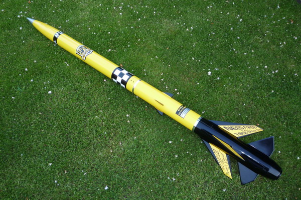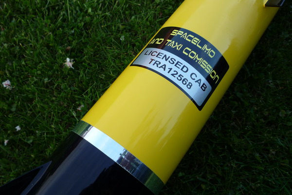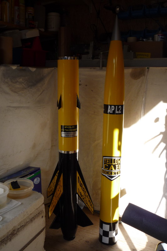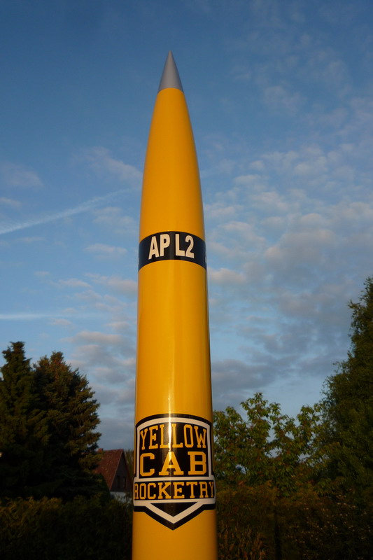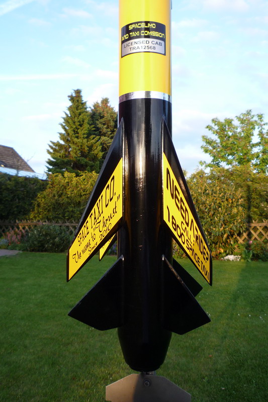Ich habe Mark Hayes von stickershock23, der auch schon die Decals für meine Harpoon gemacht hat, einfach beschrieben was ich wollte: Ein klassisches YellowCab, ein NewYork-Taxi. Ich habe Fotos aus dem Internet gesucht mit allen klassischen Details, die ich haben wollte: schwarz-weiße Karos, Chromleisten, Werbung, ein Taxischild auf dem Dach mit der Fahrzeugnummer usw. Ein paar Tage später kam eine Preview, eine Voransicht, an der kaum etwas zu verbessern war. 14 Tage später hatte ich sie in Händen. Thank you Mark for this excellent work. Länge 2,20m Durchmesser 10cm, Gewicht um 4kg. 54mm MMT, stabil genug für einen K (hoffe ich). Yellow Cab Rocketry Das klassische "checkered band", darunter die E-Bay. Die meisten Details mußte ich gar nicht vorgeben, Mark war sofort Feuer und Flamme und mit eigenen Ideen dabei. Als ich sagte ich will "a sign on the roof with the cab number" kam das zurück. every cab needs a licence plate.... Need a ride? Ich glaube, man kann erkennen was es sein soll. Ich denke auch es ist alles dran, was dran gehört. Morgen stehen Ausstoßtests an, und dann kommt das ganze Geraffel aus Leinen und Schirmen dran. Mach ich auch noch Fotos von. Gruß Jan |