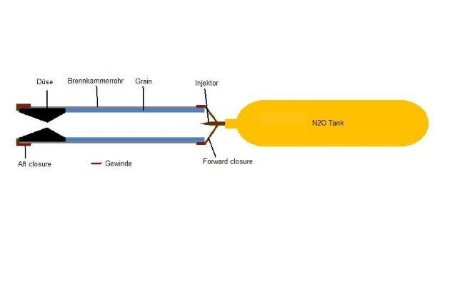 hab jetzt endlich wieder Zeit gefunden mein Projekt weiter zu verfolgen. Als Treibstoff werde ich jetzt R45-M (HTPB; hier erhältlich) verwenden. Das genaue Mischungsverhältnis habe ich mit cpropep durchgespielt und kam auf einen max. Isp von 2158 m/s (15bar Druck) bei 100g Brennstoff auf 520g N2O (soviel geht in den Tank rein, den ich verwenden werde). Der totale Impuls Itot liegt bei ca. 1338Ns und die Brennkammertemperatur bei gut 3000 K. Wahrscheinlich ist es jedoch besser etwas mehr Brennstoff zu verwenden, so ca 150-200g). weitere Informationen siehe angehängte Excel Datei Als Tank werde ich wie schon erwähnt eine alte CO2 Patrone für Sprudelautomaten verwenden, in die gehen 520g N2O rein. Der Gesamtentwurf sieht aungefähr so aus (dies ist allerdings nur eine Skizze und die genauen Proportionen stimmen noch nicht): Mein Problem ist jetzt nur die Dimensionierung des Grains wie lang und wie dick soll es sein um in der vorgegebenen zeit zu verbrennen? Gruß Moritz |